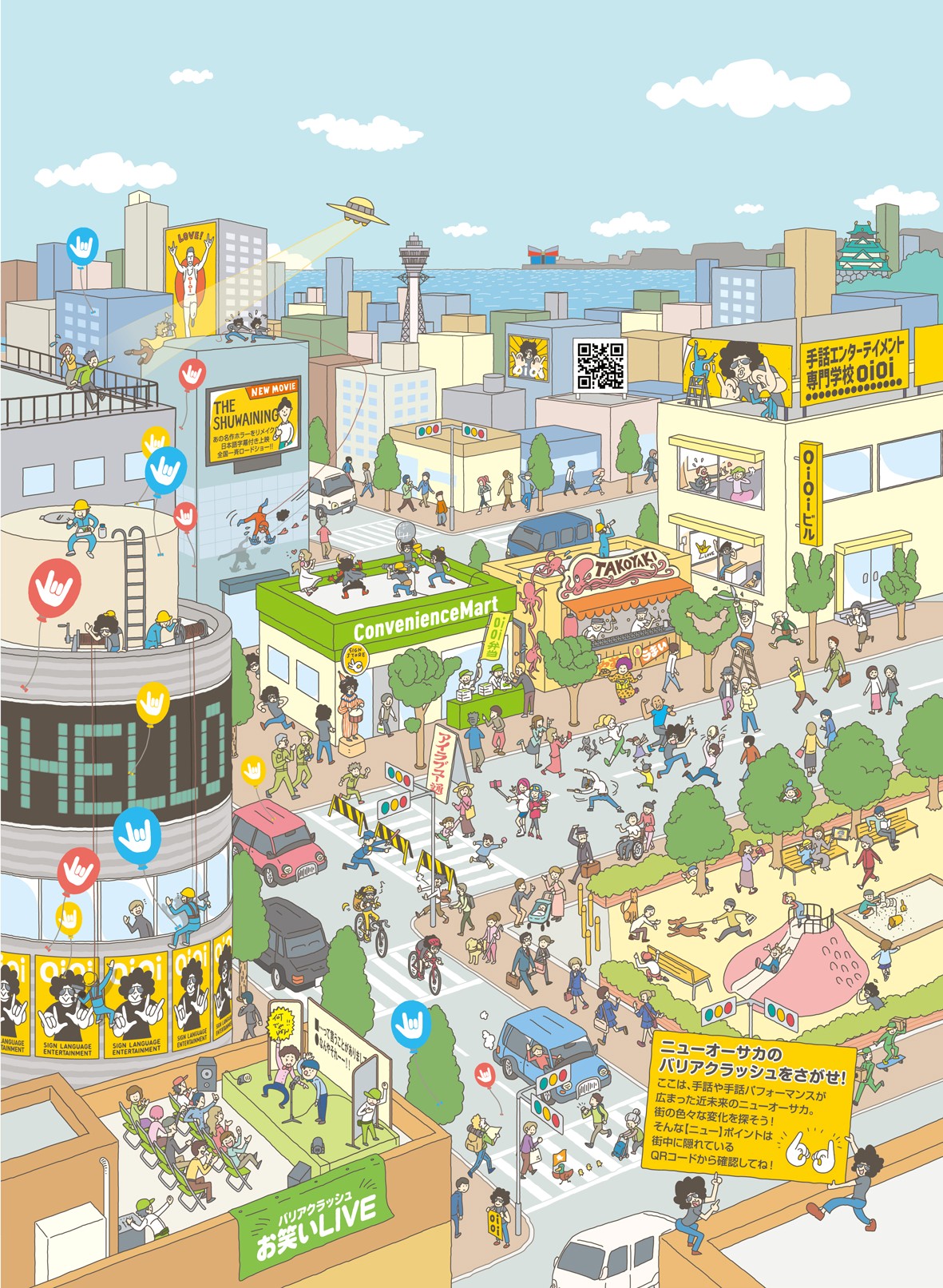 上記のイラストは、私たちが描く未来の街「ニューオーサカ」。ここには、手話や視覚情報があふれています。