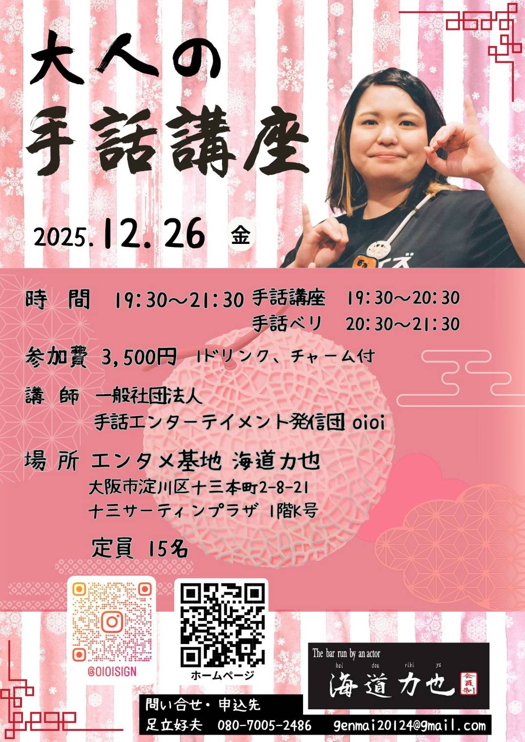 | 時間 | 19:30~21:30 手話講座 19:30〜20:30 手話べり 20:30〜21:30 |