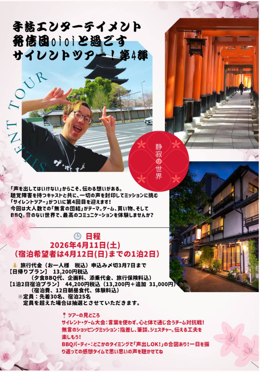 手話エンターテイメント発信団oioiと過ごすサイレントツアー!第4弾 2026 4/11 イベント予定 2026年2月20日 時間10:00~19:00場所京都駅周辺住所京都府京都市下京区東塩小路釜殿町定員30名(最低施行人数25名)料金日帰り:13,200円/宿泊:44,200円申込PDF記載のメールに件名:サイレントツアー申込本文:氏名を入力し送信してください。追って申込フォームURLを返信しますのでそちらで再度お申込ください。詳細PDF※日帰りと宿泊どちらかを選択可能です。oioiメンバーも数人宿泊します。 その他、出演情報はこちらから Learn More イベント予定 ザ・オイオイズ 出演情報 この記事が気に入ったら いいねしてね! よかったらシェアしてね! URLをコピーしました! URLをコピーしました!