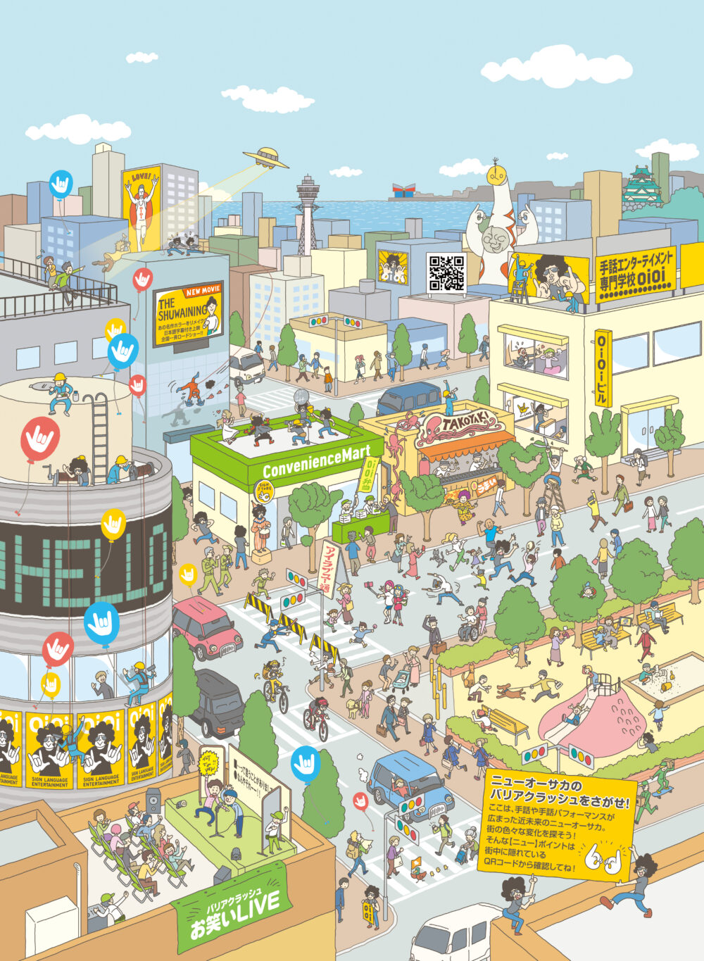 上記のイラストは、私たちが描く未来の街「ニューオーサカ」。ここには、手話や視覚情報があふれています。
