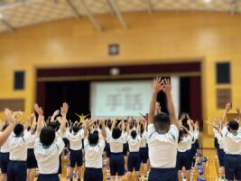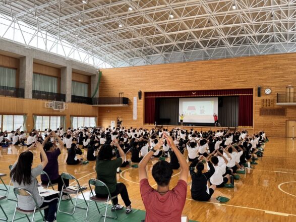 今年は「手話体操」を実施し、生徒たちはすぐに手話を覚えて元気いっぱいに体を動かしてくれました。先生方や校長先生も一緒に楽しんで参加され、学校全体で温かい空気に包まれた時間となりました。